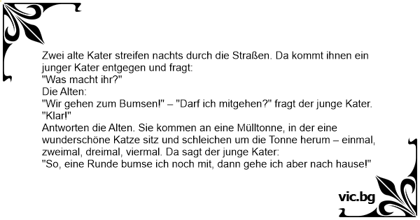 Antworten die Alten. Sie kommen an eine Mülltonne, in der eine wunderschöne Katze sitz und schleichen um die Tonne herum – einmal, zweimal, dreimal, viermal. Da sagt der junge Kater: