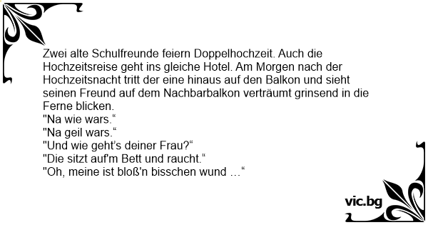 Zwei alte Schulfreunde feiern Doppelhochzeit. Auch die Hochzeitsreise geht ins gleiche Hotel. Am Morgen nach der Hochzeitsnacht tritt der eine hinaus auf den Balkon und sieht seinen Freund auf dem Nachbarbalkon verträumt grinsend in die Ferne blicken.
