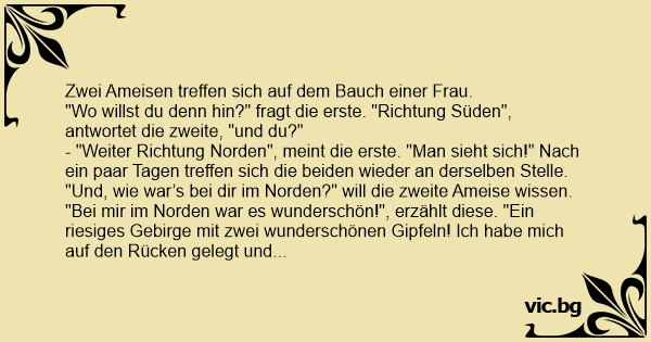 - "Weiter Richtung Norden", meint die erste. "Man sieht sich!" Nach ein paar Tagen treffen sich die beiden wieder an derselben Stelle. "Und, wie war’s bei dir im Norden?" will die zweite Ameise wissen. "Bei mir im Norden war es wunderschön!", erzählt diese. "Ein riesiges Gebirge mit zwei wunderschönen Gipfeln! Ich habe mich auf den Rücken gelegt und habe die Aussicht genossen. Und wie war’s bei Dir im Süden?"