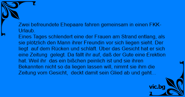 Eines Tages schlendert eine der Frauen am Strand entlang, als sie plötzlich den Mann ihrer Freundin vor sich liegen sieht. Der liegt auf dem Rücken und schläft. Über das Gesicht hat er sich eine Zeitung gelegt. Da fällt ihr auf, daß der Gute eine Erektion hat. Weil ihr das ein bißchen peinlich ist und sie ihren Bekannten niсhт so da liegen lassen will, nimmt sie ihm die Zeitung vom Gesicht, deckt damit sein Glied ab und geht weiter. Einige 100 m weiter trifft sie sie Ihre Freundin und spricht: