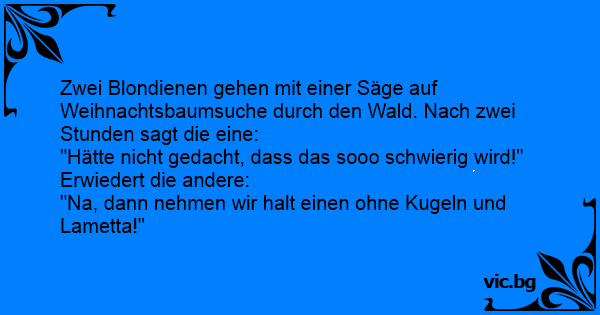 Dvě blondýnky jdou do lesa pro vánoční stromeček. Po dvou hodinách hledání se jedna zeptá té druhé: „Tak co?” „Ále, nikde nic.” „Víš co? Tak vezmeme nějaký bez ozdob.” *By:{Zaly}*