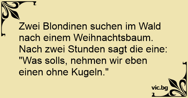 Dvě blondýnky jdou do lesa pro vánoční stromeček. Po dvou hodinách hledání se jedna zeptá té druhé: „Tak co?” „Ále, nikde nic.” „Víš co? Tak vezmeme nějaký bez ozdob.” *By:{Zaly}*