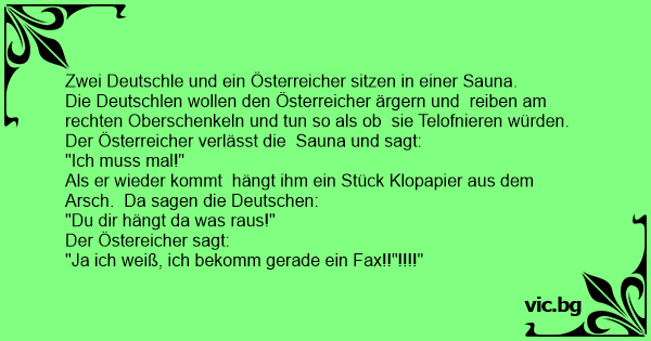Die Deutschlen wollen den Österreicher ärgern und reiben am rechten Oberschenkeln und tun so als ob sie Telofnieren würden. Der Österreicher verlässt die Sauna und sagt: