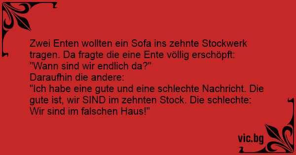 Du vyrai į devintą aukštą neša sunkią spintą. Vienas jų sako kitam: - Eik pažiūrėk kiek aukštų liko. Tas pažiūrėjęs sako: - Turiu gerą ir blogą žinią. - Pirmiau sakyk gerą. - Mums beliko du...