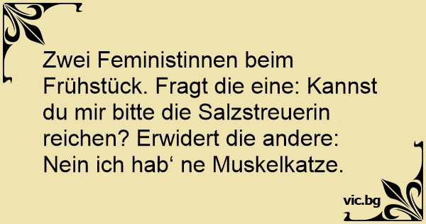 Zwei Feministinnen beim Frühstück. Fragt die eine: Kannst du mir bitte die Salzstreuerin reichen? Erwidert die andere: Nein ich hab‘ ne Muskelkatze.