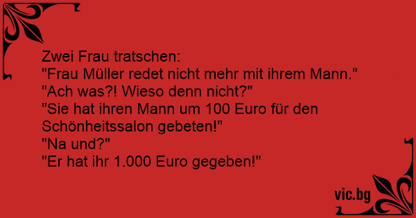 "Frau Müller spricht nicht mehr mit Ihrem Mann." "Weshalb?" "Sie bat ihn, ihr Hundert Euro für den Schönheitssalon zu geben." "Na und?" "Er gab ihr Tausend ...!"