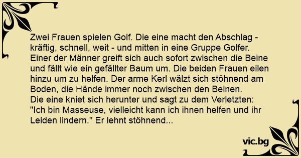 Zwei Frauen spielen Golf. Die eine macht den Abschlag - kräftig, schnell, weit - und mitten in eine Gruppe Golfer. Einer der Männer greift sich auch sofort zwischen die Beine und fällt wie ein gefällter Baum um. Die beiden Frauen eilen hinzu um zu helfen. Der arme Kerl wälzt sich stöhnend am Boden, die Hände immer noch zwischen den Beinen.