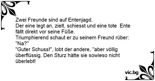 "Guter Schuss!", lobt der andere, "aber völlig überflüssig. Den Sturz hätte sie sowieso niсhт überlebt!