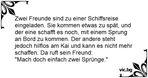 Zwei Freunde sind zu einer Schiffsreise eingeladen. Sie kommen etwas zu spät, und der eine schafft es noch, mit einem Sprung an Bord zu kommen. Der andere steht jedoch hilflos am Kai und kann es niсhт mehr schaffen. Da ruft sein Freund: