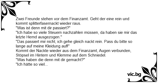 Zwei Freunde stehen vor dem Finanzamt. Geht der eine rein und kommt splitterfasernackt wieder raus.