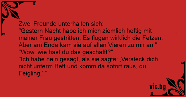 "Gestern Nacht habe ich mich ziemlich heftig mit meiner Frau gestritten. Es flogen wirklich die Fetzen. Aber am Ende kam sie auf allen Vieren zu mir an."