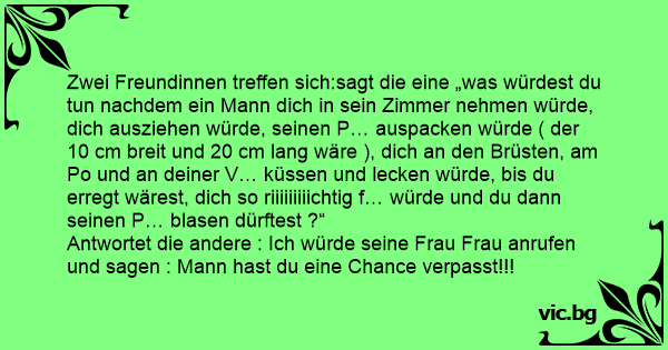 Zwei Freundinnen treffen sich:sagt die eine „was würdest du tun nachdem ein Mann dich in sein Zimmer nehmen würde, dich ausziehen würde, seinen P… auspacken würde ( der 10 cm breit und 20 cm lang wäre ), dich an den Brüsten, am Po und an deiner V… küssen und lecken würde, bis du erregt wärest, dich so riiiiiiiiichtig f… würde und du dann seinen P… blasen dürftest ?“