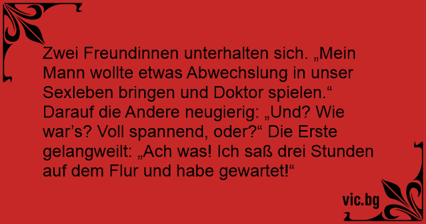 Zwei Freundinnen unterhalten sich. „Mein Mann wollte etwas Abwechslung in unser Sexleben bringen und Doktor spielen.“ Darauf die Andere neugierig: „Und? Wie war’s? Voll spannend, oder?“ Die Erste gelangweilt: „Ach was! Ich saß drei Stunden auf dem Flur und habe gewartet!“