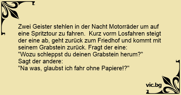 Zwei Geister stehlen in der Nacht Motorräder um auf eine Spritztour zu fahren. Kurz vorm Losfahren steigt der eine ab, geht zurück zum Friedhof und kommt mit seinem Grabstein zurück. Fragt der eine:
