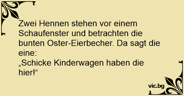 Zwei Hennen stehen vor einem Schaufenster und betrachten die bunten Oster-Eierbecher. Da sagt die eine: