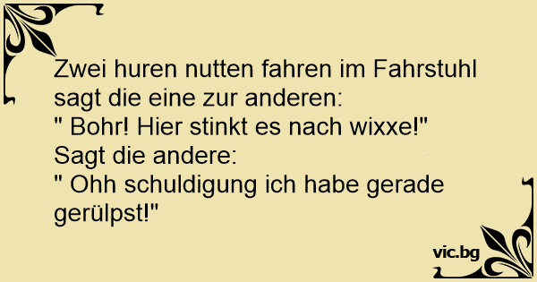 Treffen sich zwei Nutten im Fahrstuhl "Igitt, was riecht das hier nach Sperma!" Die andere darauf: "Nun stell Dich mal nicht so an, man darf ja wohl mal aufstossen dürfen."