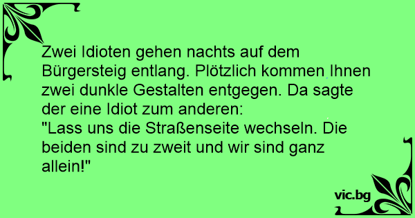 Zwei Idioten gehen nachts auf dem Bürgersteig entlang. Plötzlich kommen Ihnen zwei dunkle Gestalten entgegen. Da sagte der eine Idiот zum anderen: