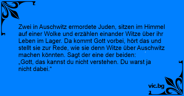Zwei in Auschwitz ermordete Juden, sitzen im Himmel auf einer Wolke und erzählen einander Witze über ihr Leben im Lager. Da kommt Gott vorbei, hört das und stellt sie zur Rede, wie sie denn Witze über Auschwitz machen könnten. Sagt der eine der beiden: