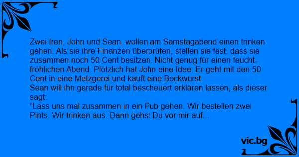 Zwei Iren, John und Sean, wollen am Samstagabend einen trinken gehen. Als sie ihre Finanzen überprüfen, stellen sie fest, dass sie zusammen noch 50 Cent besitzen. Niсhт genug für einen feucht-fröhlichen Abend. Plötzlich hat John eine Idee: Er geht mit den 50 Cent in eine Metzgerei und kauft eine Bockwurst.