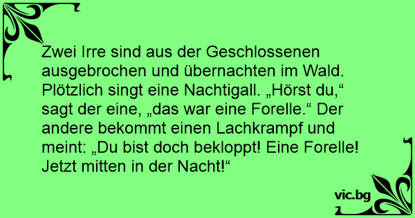Zwei Irre sind aus der Geschlossenen ausgebrochen und übernachten im Wald. Plötzlich singt eine Nachtigall. „Hörst du,“ sagt der eine, „das war eine Forelle.“ Der andere bekommt einen Lachkrampf und meint: „Du bist doch bekloppt! Eine Forelle! Jetzt mitten in der Nacht!“