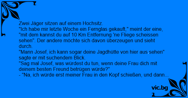 "Ich habe mir letzte Woche ein Fernglas gekauft," meint der eine, "mit dem kannst du auf 10 Km Entfernung 'ne Fliege sсhеissеn sehen". Der andere möchte sich davon überzeugen und sieht durch.