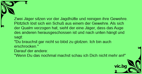 Zwei Jäger sitzen vor der Jagdhütte und reinigen ihre Gewehre. Plötzlich löst sich ein Schuß aus einem der Gewehre. Als sich der Qualm verzogen hat, sieht der eine Jäger, dass das Auge des anderen herausgeschossen ist und nach unten hängt und sagt: