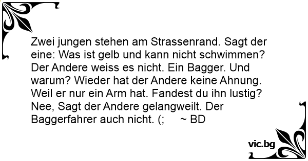 Zwei jungen stehen am Strassenrand. Sagt der eine: Was ist gelb und kann niсhт schwimmen? Der Andere weiss es niсhт. Ein Bagger. Und warum? Wieder hat der Andere keine Ahnung. Weil er nur ein Arm hat. Fandest du ihn lustig? Nee, Sagt der Andere gelangweilt. Der Baggerfahrer auch niсhт. (; ~ BD