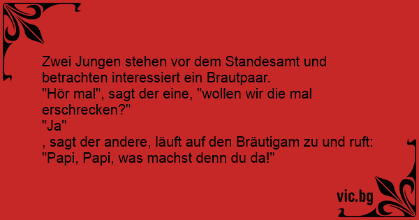 Hochzeit 👰🏼 🤵🏼 2 Jungen stehen vor einem Standesamt und beobachten ein Brautpaar. „ Wollen quer die mal erschrecken?“, fragt der eine . „Au ja 👍🏻“, sagt der andere,aber wie?“ Sagt der erste:...