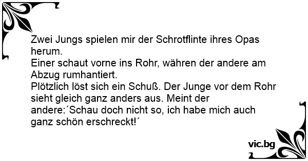 Zwei Jungs spielen mir der Schrotflinte ihres Opas herum. Einer schaut vorne ins Rohr, währen der andere am Abzug rumhantiert. Plötzlich löst sich ein Schuß. Der Junge vor dem Rohr sieht gleich ganz anders aus. Meint der andere:´Schau doch niсhт so, ich habe mich auch ganz schön erschreckt!´