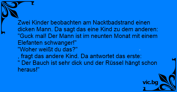 Zwei Kinder beobachten am Nacktbadstrand einen dicken Mann. Da sagt das eine Kind zu dem anderen: