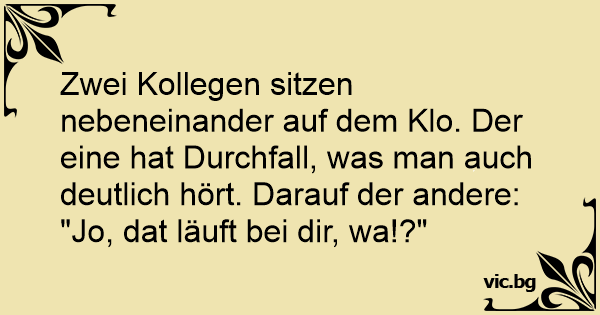 Zwei Kollegen sitzen nebeneinander auf dem Klo. Der eine hat Durchfall, was man auch deutlich hört. Darauf der andere: