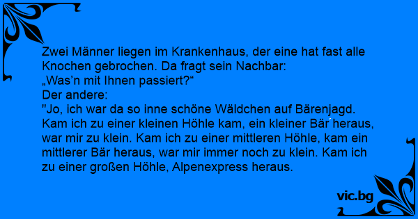 Zwei Männer liegen im Krankenhaus, der eine hat fast alle Knochen gebrochen. Da fragt sein Nachbar: