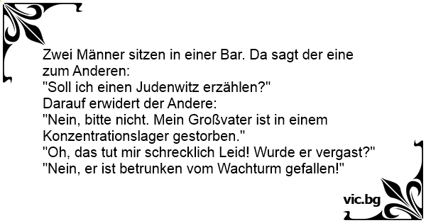 в общем, идет в школе урок посвященный великой отечественной войне,... на уроке истории учительница рассказывает детям о концлагере... Повече не искам да чувам никакви смешки за Втората световна война и концлагерите. Beide meiner Opa’s sind im KZ gestorben! - Mon père est mort dans un camp de concentration... - C'est horrible... - Oui, il est tombé du mirador !? Pani w szkole pyta się Jasia: - Jasiu, kim był Twój dziadek? - Był żołnierzem, zmarł na wojnie. - Zginął za ojczyznę. - Nie, upił się i spadł z wieżyczki. Snälla visa lite respekt. Inga skämt om koncentrationsläger tack, för min morfar dog i ett. - Han trillade ner från ett vakttorn och slog ihjäl sig. Koncentrationslejr Den ene til den anden: “Min far døde under krigen i en koncentrationslejr” “Det var da tragisk”, siger den anden. “Ja – han faldt ned fra et vagttårn og var død på stedet” На уроці історії вчителька розповідає дітям про концтабір ГУЛАГ. - А мій дідусь загинув в ГУЛАзі, - кричить Вовочка. - Що, його комуняки замучили? - Та ні, він був п'яний й впав зі сторожової вежі. Kuulin kamalan huhun, että Pekan isä kuoli Puolassa keskitysleirillä! Juu hän putosi vartiotornista... Min farfar døde i Auschwitz. - Nej, hvor forfærdeligt ! - Ja, han faldt ned fra vagttårnet. Történelem órán a tanárnő megkérdi, hogy ki tud valamit a második világháborúról. Erre Móricka jelentekezik, a tanár fel is szólítja. - Na, Te mit tudsz róla Móricka? - Hát az én nagypapám egy... Min onkel døde i en KZ lejr. - Han faldt ned fra vagttårnet Wusstest Du dass Jörg Haiders Grossvater im Krieg in einem KZ umgekommen ist? Er ist besoffen vom Wachturm gefallen!! A suliban a tanárnő megkérdezi az osztálytól, kinek halt már meg rokona. Móricka gyorsan felrakja kezét, majd a tanárnő megkérdezi, kije halt meg. - Édesapám - feleli Móriczka. - Hol halt meg? -...