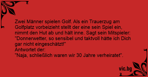 Zwei Golfspieler sind am 12. Grün, als ein Leichenzug vorbeikommt. Der eine hält im Spiel inne und verneigt sich kurz zu dem Leichenwagen hin. "Das war aber eine sehr noble Geste von Ihnen. ", sagt...
