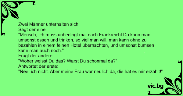 "Mensch, ich muss unbedingt mal nach Frankreich! Da kann man umsonst essen und trinken, so viel man will, man kann ohne zu bezahlen in einem feinen Hotel übernachten, und umsonst вuмsеn kann man auch noch."