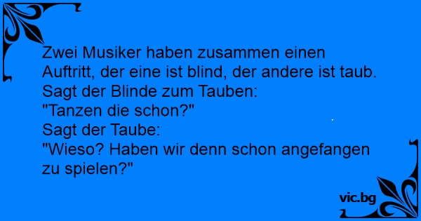 Zwei Musiker haben zusammen einen Auftritt, der eine ist blind, der andere ist taub. Sagt der Blinde zum Tauben: