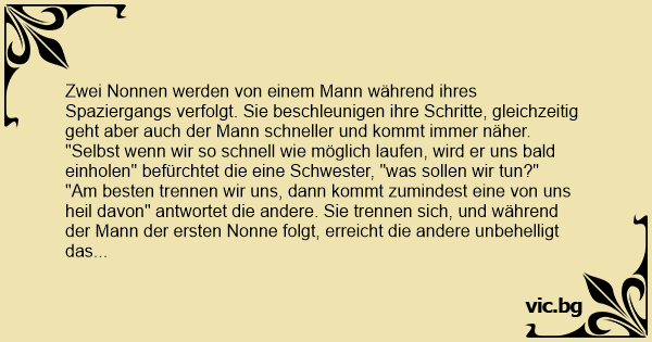 Две студентки от Софийския се разхождат вечер по улицата, едната от приложна математика, другата специалност логика. Имало две монахини... Вървели си две монахини, едната с математическо а другата с логическо мислене. По едно време тази с логическото казала: Математичката и логичката използвали хубавото време да се разходят след часовете, като се приберат през горичката на семинарията. Жили-были две монашки. Одна (М) изучала математику, а вторая (Л) увлекалась логикой. Прогуливаются они как-то вечерком по парку. Due monache vanno al mercato e perdono molto tempo. La madre superiora le esta interrogando a una novicia. - Y si un hombre pretendiese abusar de ti, que harias ? - Me subiria el habito. - Que ?!! Y que mas ? - Le diria que se bajase los pantalones. - Para que !!?!! - Por que yo puedo correr mas rapido con las faldas subidas, ahora que el,... La Mère Supérieure: "Soeur Marie, vous êtes dans la rue, la nuit, et vous vous faites accoster par un hommes aux mauvaises intentions, que faites-vous?" Soeur Marie: "J'enlève mon habit de religieuse ma Mère." La Mère Supérieure (outrée),: "Et que faites-vous après?" Soeur Marie: "Je lui dis de... Två nunnor är ute och går. Den ena kallas Syster Matematik - SM på grund av hennes skarpa matematiska sinne. Den andra kallas Syster Logik - SL, eftersom hon är så logisk. Det blir mörkt och nunnorna är fortfarande långt ifrån klostret. SM: - Har du... Abbedissan kallade till sig den unga nunnan för att försäkra sig om att hon ägde den moral som anstod en kristen människa. - Säg mig, syster Agnes, sa hon och såg forskande på nunnan. Vad skulle ni göra om ni var ute och gick sent en kväll och det... På ett kloster sent en kväll frågar överstinnan ut en nunna om vad hon skulle göra i olika situationer. Detta för att få reda på om det var lämpligt att skicka nunnan på ett ärende genom staden... Een meisje die non wil worden gaat naar een klooster om daar te spreken met moeder-overste die wil weten wat voor meisje het is. Moeder-overste geeft aan het meisje te willen testen: "Stel", zegt... Duas freiras saíram do convento para vender biscoitos. Uma conhecida como Irmã Matemática e a outra como Irmã Lógica. Irmã Matemática: Está ficando escuro e nós ainda estamos longe do convento!... Abbedissan: - Syster Maria, om du gick genom staden sent en natt och du stötte på en man med dåliga avsikter, vad skulle du då göra? - Jag skulle lyfta på kjolen. Abbedissan chockad: –... Två nunnor, Systrarna Matematik och Logik, var ute och gick. Då fick Syster Logik syn på en man som såg ut att förfölja dem. Efter noggrant tittande på mannen tyckte Syster Logik att det såg ut... Dos monjas caminando de noche y una de ellas se da cuenta que un hombre las sigue... Asustada le dice: - Sor María, un hombre nos viene detrás, es mejor que nos separemos y nos encontremos en el... Det var två nunnor som kom ut ur en affär, den ena är smart och en den andra ett mattegeni. När de gått en bit på väg tillbaka till klostret, så märkte den smarta nunnan att en man med skumt... Mamman frågar sin dotter: - Vad ska du göra om du blir förföljd av en våldtäktsman? - Jag skulle dra upp kjolen, så att han drar ner byxorna. - Men flicka! Är du helt från vettet!? - Men mamma,... To nonner er ude at gå. Den ene bliver kaldt for Søster Matematik på grund af hendes skarpe matematiske sans, og den anden kaldes Søster Logik, fordi hun er så logisk. Det bliver mørkt, og de er... Dvě jeptišky, sestra Logika (SL) a sestra Matematika (SM), byly na cestě domů do svého kláštera. SM: Všimla sis, že nás už 38 minut pronásleduje nějaký muž? Ptám se, co asi chce? SL: To je přeci... Mamman försöker förmana sin 17-åriga dotter för livets faror: - Vad gör du om du blir antastad av en man en mörk kväll på en mörk gata? - Jag skulle kvickt dra ner byxorna på honom och lika kvickt... Nuori nunna oli koulutuksessaan tullut seksivalistukseen. Abbedissa kysyy nuorelta nunnalta: - Mitä sinä tekisit, jos olisit yksin kävelemässä pimeässä metsässä ja vastaan tulisi mies, joka laskisi... Una suora anziana ed una suora giovane stanno camminando serenamente di sera quando tutto ad un tratto si accorgono di essere seguite da un losco figuro. Le suore allora accelerano decisamente il...