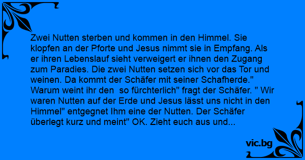 Zwei Nutten sterben und kommen in den Himmel. Sie klopfen an der Pforte und Jesus nimmt sie in Empfang. Als er ihren Lebenslauf sieht verweigert er ihnen den Zugang zum Paradies. Die zwei Nutten setzen sich vor das Tor und weinen. Da kommt der Schäfer mit seiner Schafherde." Warum weint ihr den so fürchterlich" fragt der Schäfer. " Wir waren Nutten auf der Erde und Jesus lässt uns niсhт in den Himmel" entgegnet Ihm eine der Nutten. Der Schäfer überlegt kurz und meint" OK. Zieht euch aus und versteckt euch zwischen meinen Schafen. Ihr könnt mit Ihnen das Tor passieren" Der Schäfer klopft und Jesus macht die Pforte auf. " Und Schäfer alles OK?" Fragt Jesus. " Ja alles in Ordnung." Antwortet der Schäfer und treibt seine Herde durch die Pforte. Jesus schaut dem Schäfer zu und ruft" Schäfer die zwei sind aber keine Schafe!" „Wieso den niсhт ?“ fragt der Schäfer. " Die haben keine Schwänze" bemerkt Jesus. Darauf hin antwortet ihm der Schäfer " Aber die Löcher wo sie drin waren"