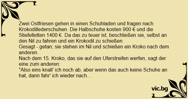 Zwei Ostfriesen gehen in einen Schuhladen und fragen nach Krokodillederschuhen. Die Halbschuhe kosten 900 € und die Stiefelletten 1400 €. Da das zu teuer ist, beschließen sie, selbst an den Nil zu fahren und ein Krokodil zu schießen.