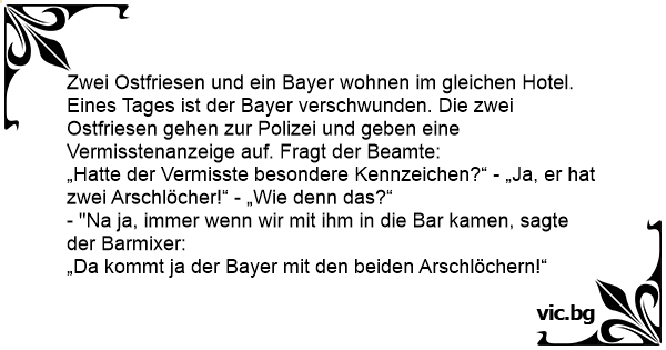 Zwei Ostfriesen und ein Bayer wohnen im gleichen Hotel. Eines Tages ist der Bayer verschwunden. Die zwei Ostfriesen gehen zur Polizei und geben eine Vermisstenanzeige auf. Fragt der Beamte: