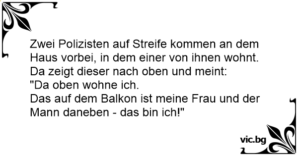 Zwei Polizisten auf Streife kommen an dem Haus vorbei, in dem einer von ihnen wohnt. Da zeigt dieser nach oben und meint:
