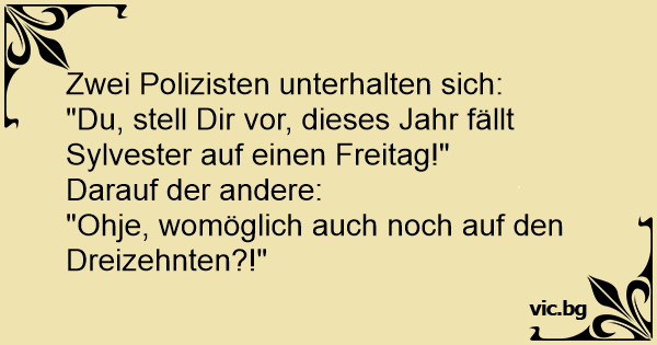 Két rendőr beszélget: - Tudtad, hogy idén péntekre esik a szilveszter? Mire a másik: - Remélem nem tizenharmadika!