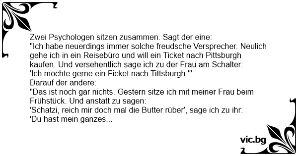 "Ich habe neuerdings immer solche freudsche Versprecher. Neulich gehe ich in ein Reisebüro und will ein Ticket nach Pittsburgh kaufen. Und versehentlich sage ich zu der Frau am Schalter: