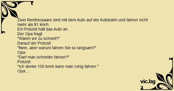 Két idős házaspár hajt autójukkal a német autópályán, pontosan 81 km/h-val. Egy rendőr megállítja az autójukat. Az egyik öreg megkérdi: - Túl gyorsan hajtottunk? Erre a rendőr: - Ellenkezőleg....