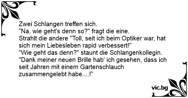 "Dank meiner neuen Brille hab' ich gesehen, dass ich seit Jahren mit einem Gartenschlauch zusammengelebt habe....!"