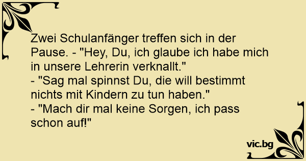 Zwei Schulanfänger treffen sich in der Pause. - "Hey, Du, ich glaube ich habe mich in unsere Lehrerin verknallt."