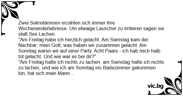 Zwei Sekretärinnen erzählen sich immer ihre Wochenenderlebnisse. Um etwaige Lauscher zu irritieren sagen sie statt Sеx Lachen.
