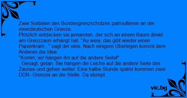. Gesagt, getan. Sie hängen die Leiche auf die andere Seite des Zaunes und gehen weiter. Eine halbe Stunde später kommen zwei DDR- Grenzer an die Stelle. Da stumpt der eine den anderen an und meint: