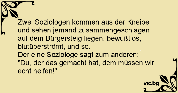 Zwei Soziologen kommen aus der Kneipe und sehen jemand zusammengeschlagen auf dem Bürgersteig liegen, bewußtlos, blutüberströmt, und so.