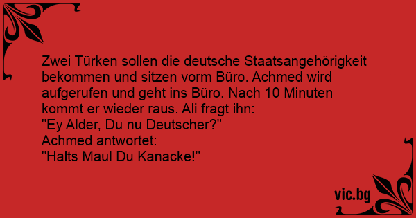 Zwei Türken sollen die deutsche Staatsangehörigkeit bekommen und sitzen vorm Büro. Achmed wird aufgerufen und geht ins Büro. Nach 10 Minuten kommt er wieder raus. Ali fragt ihn: